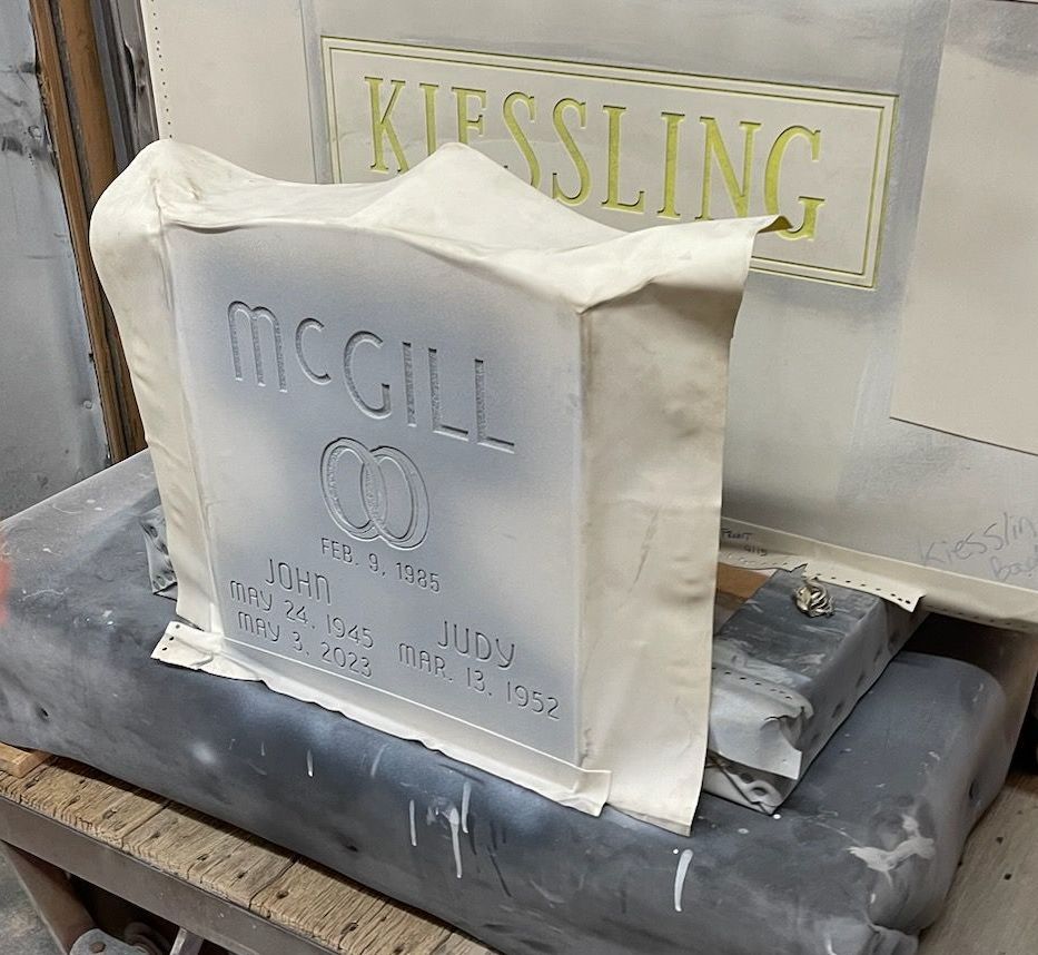 Once the drawing is approved, we move to the engraving process. We lay a stencil of the design on the memorial, and engrave (sandblast) the design and lettering into the memorial. We also shape carve flowers to make them appear more realistic. Every memorial is engraved in our shop so we are able to control the quality.